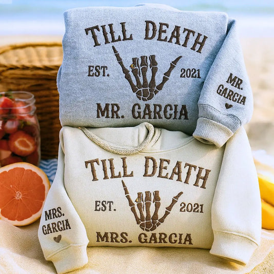 Custom Embroidered Skeleton Till Death Married Couple Mr Mrs Matching Newlywed Husband and Wife Sweatshirt or Hoodie